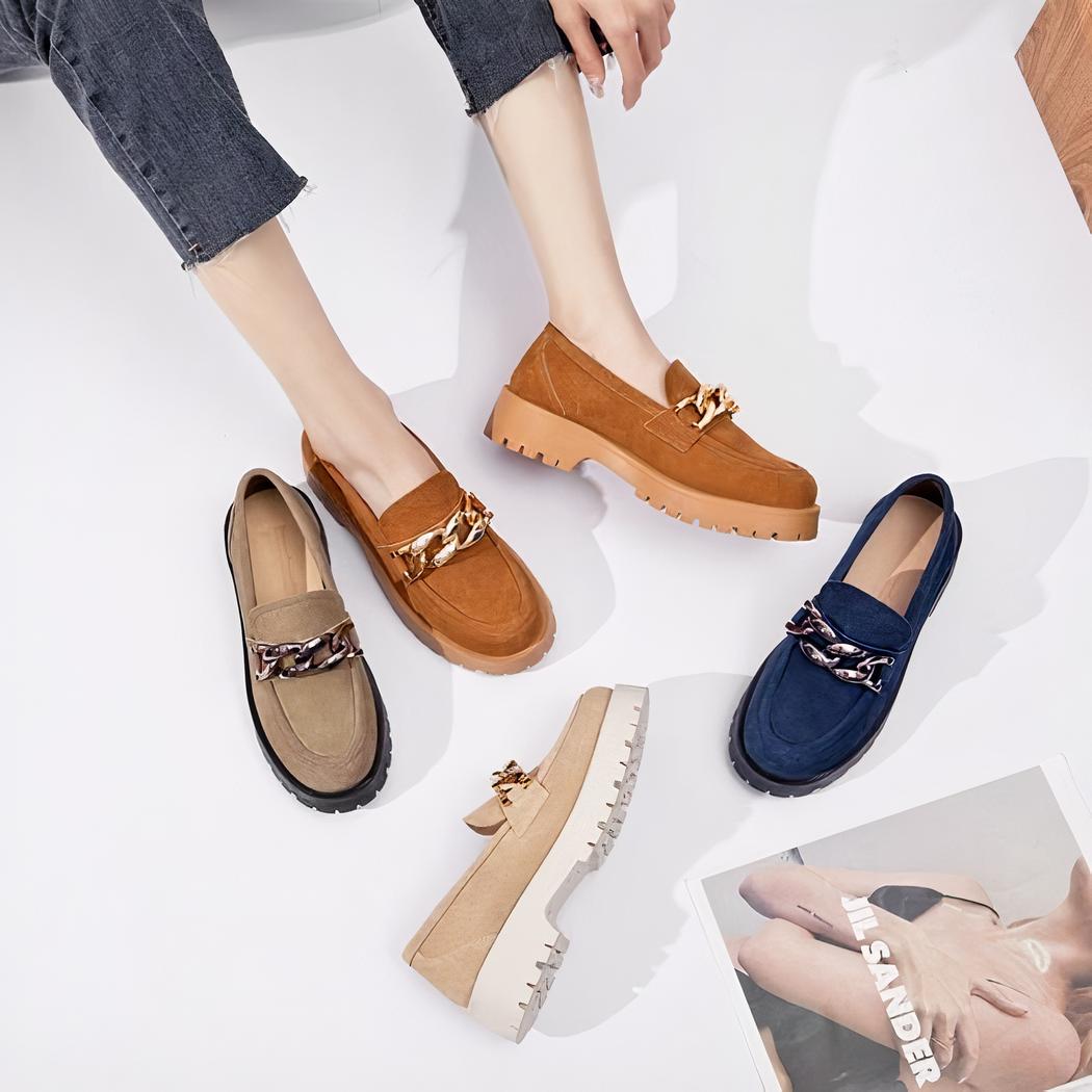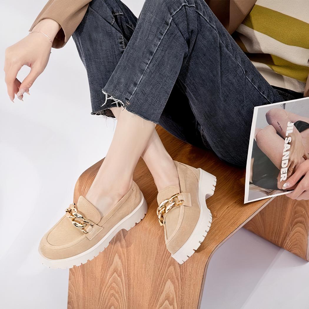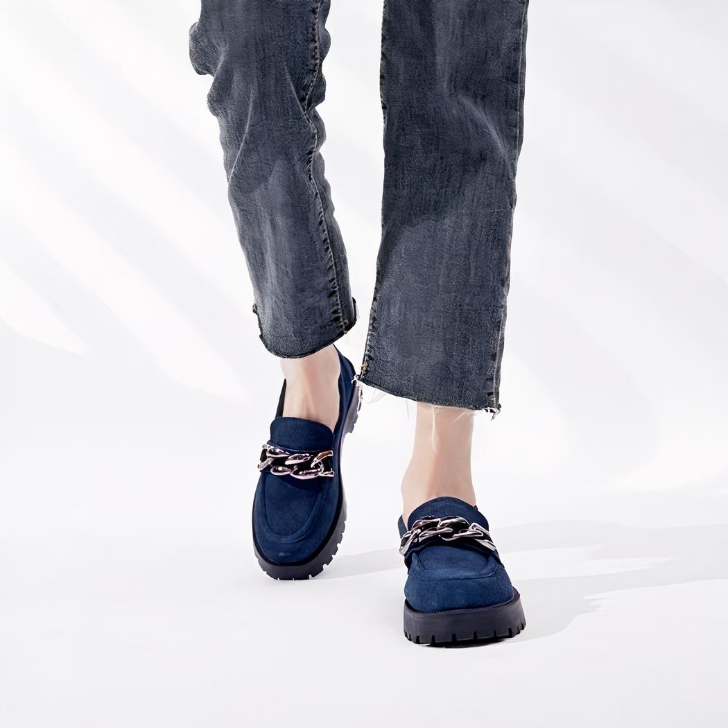 Avec ces mocassins, rompez avec le style traditionnel de cette chaussure. Le daim est bien sûr un intemporel, mais la grande boucle dorée en forme de chaîne XXL et l’épaisse semelle en caoutchouc viennent revisiter ce grand classique de la garde-robe féminine. Si vous cherchez une pièce originale pour compléter vos tenues au quotidien, craquez pour cette paire de mocassins !