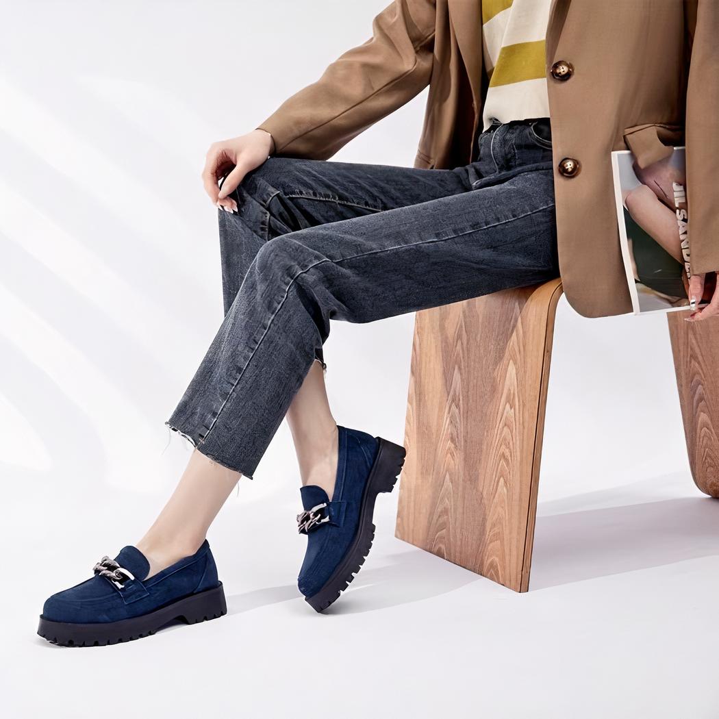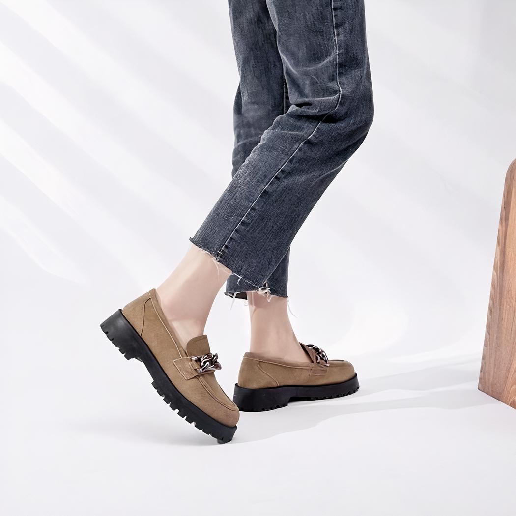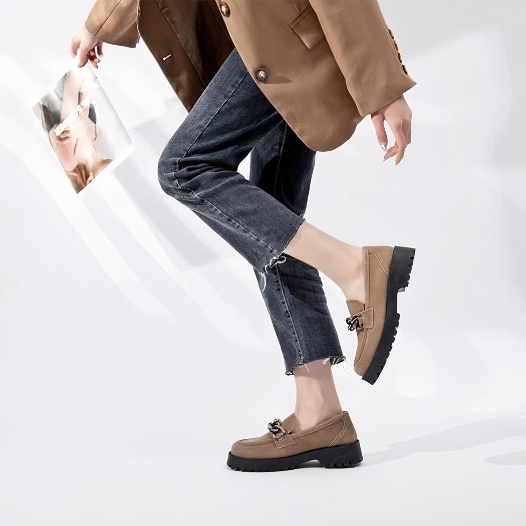 Avec ces mocassins, rompez avec le style traditionnel de cette chaussure. Le daim est bien sûr un intemporel, mais la grande boucle dorée en forme de chaîne XXL et l’épaisse semelle en caoutchouc viennent revisiter ce grand classique de la garde-robe féminine. Si vous cherchez une pièce originale pour compléter vos tenues au quotidien, craquez pour cette paire de mocassins !