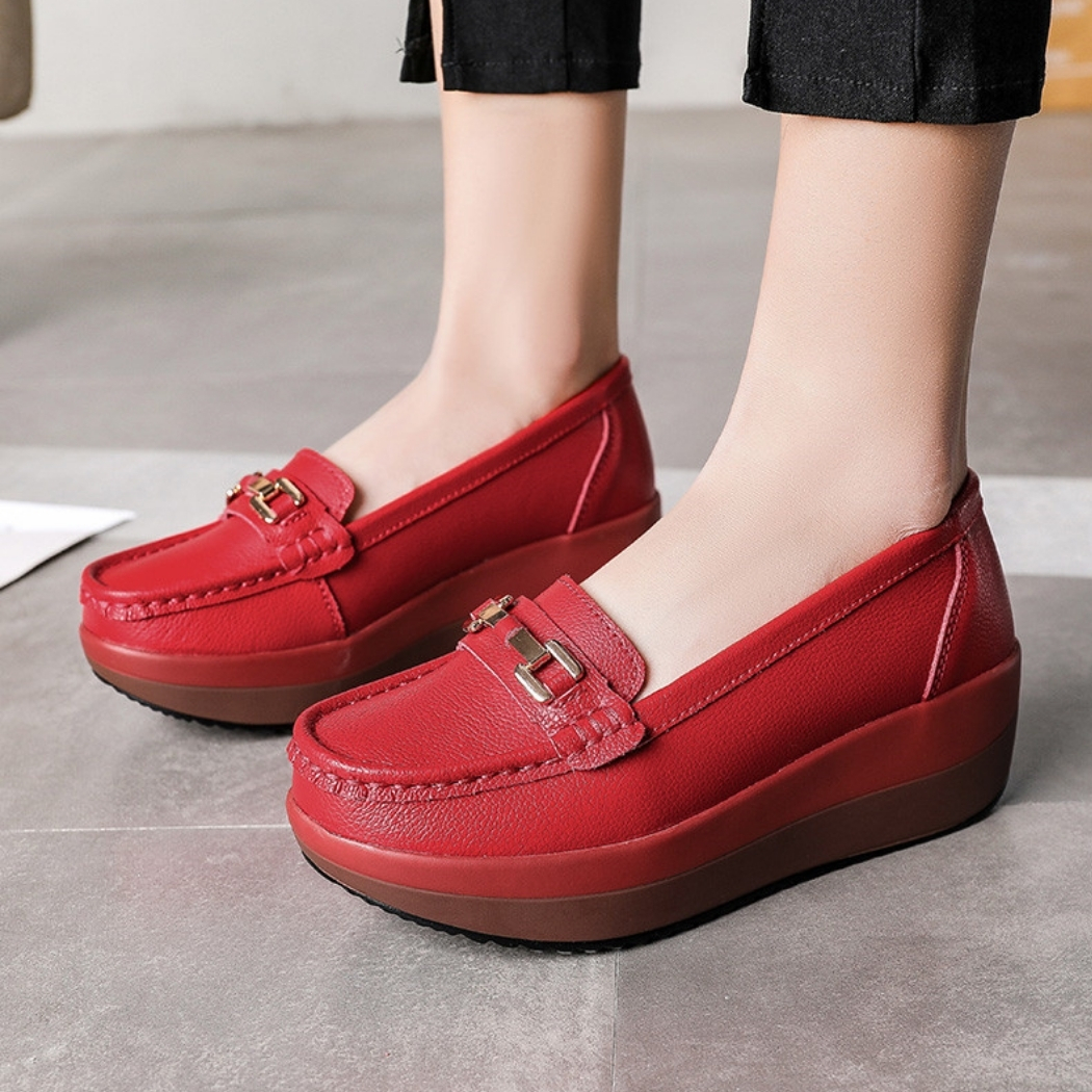 Découvrez notre paire de mocassins orthopédiques rouges à plateformes. Ces chaussures pour femme sont l’alliance parfaite entre confort et style.