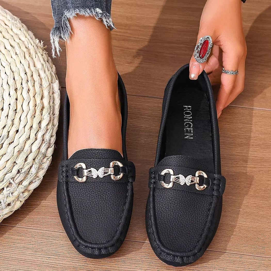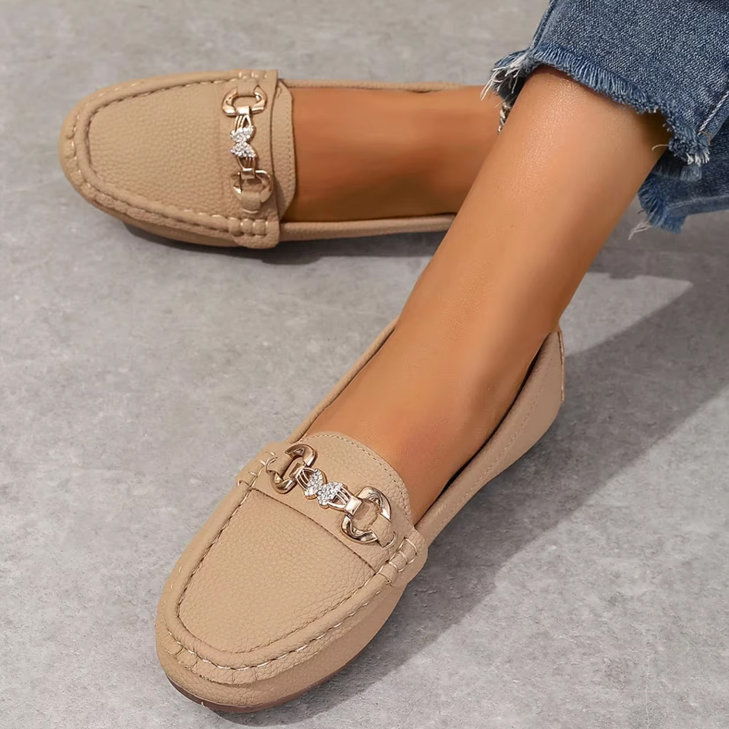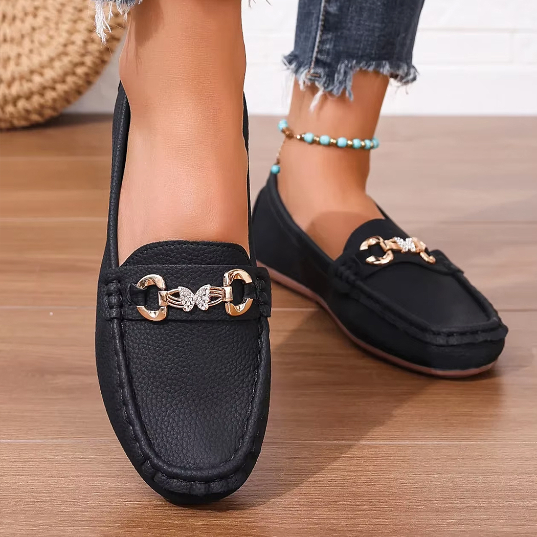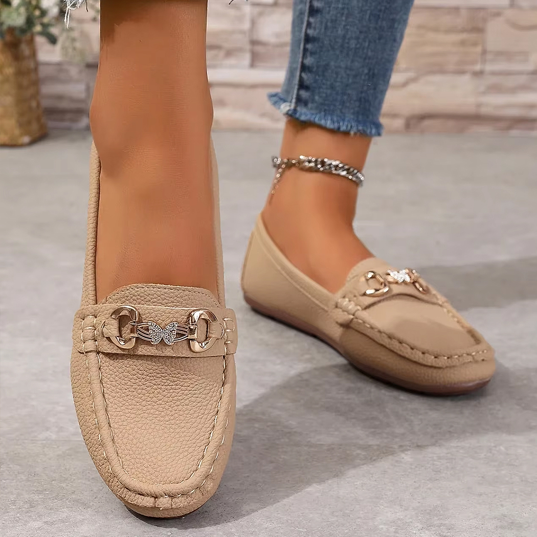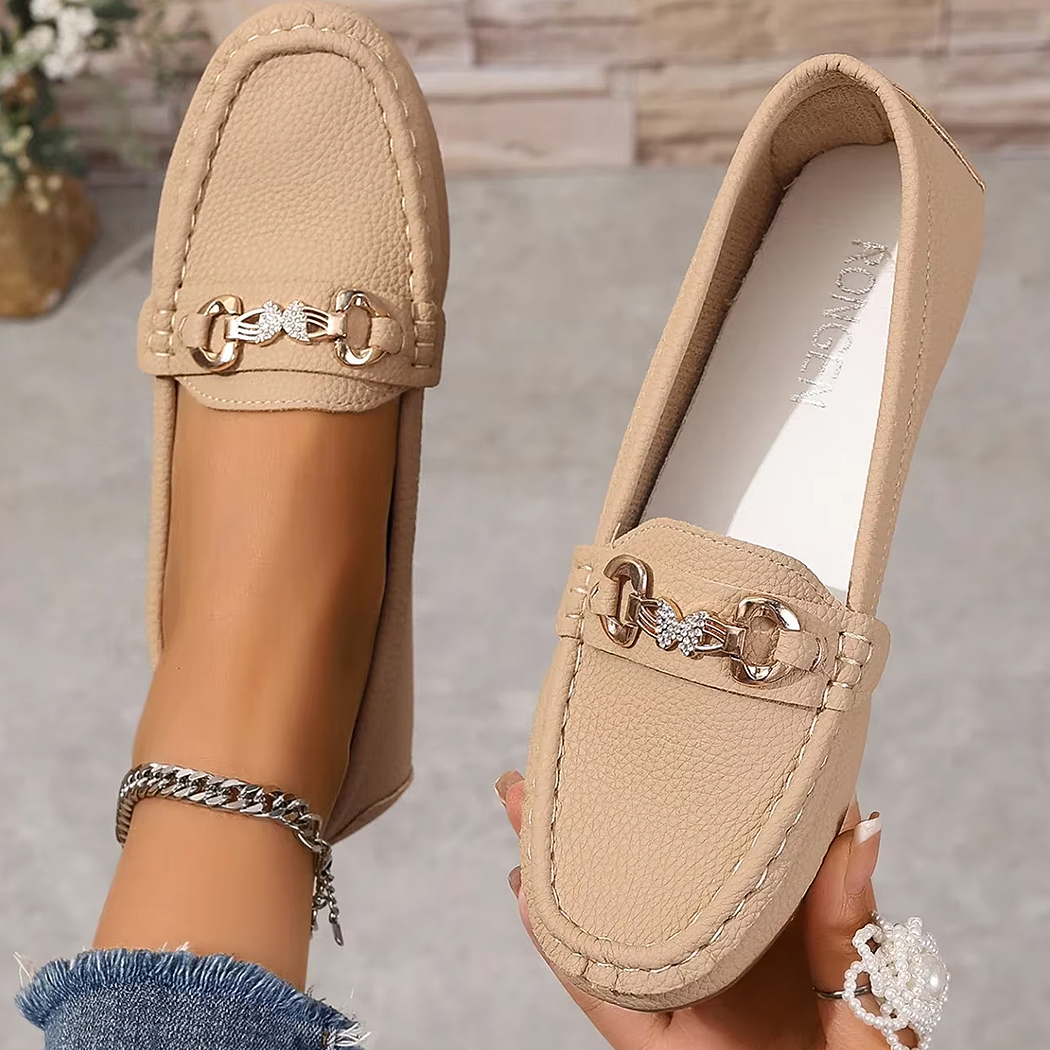Apportez une touche d’élégance à votre quotidien avec ces mocassins décontractés ornés d’un détail en chaîne métallique et d’un papillon en strass.