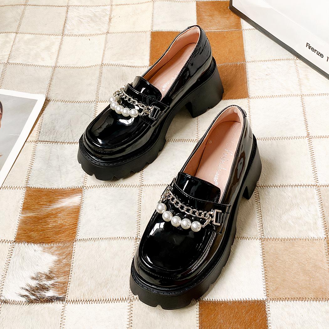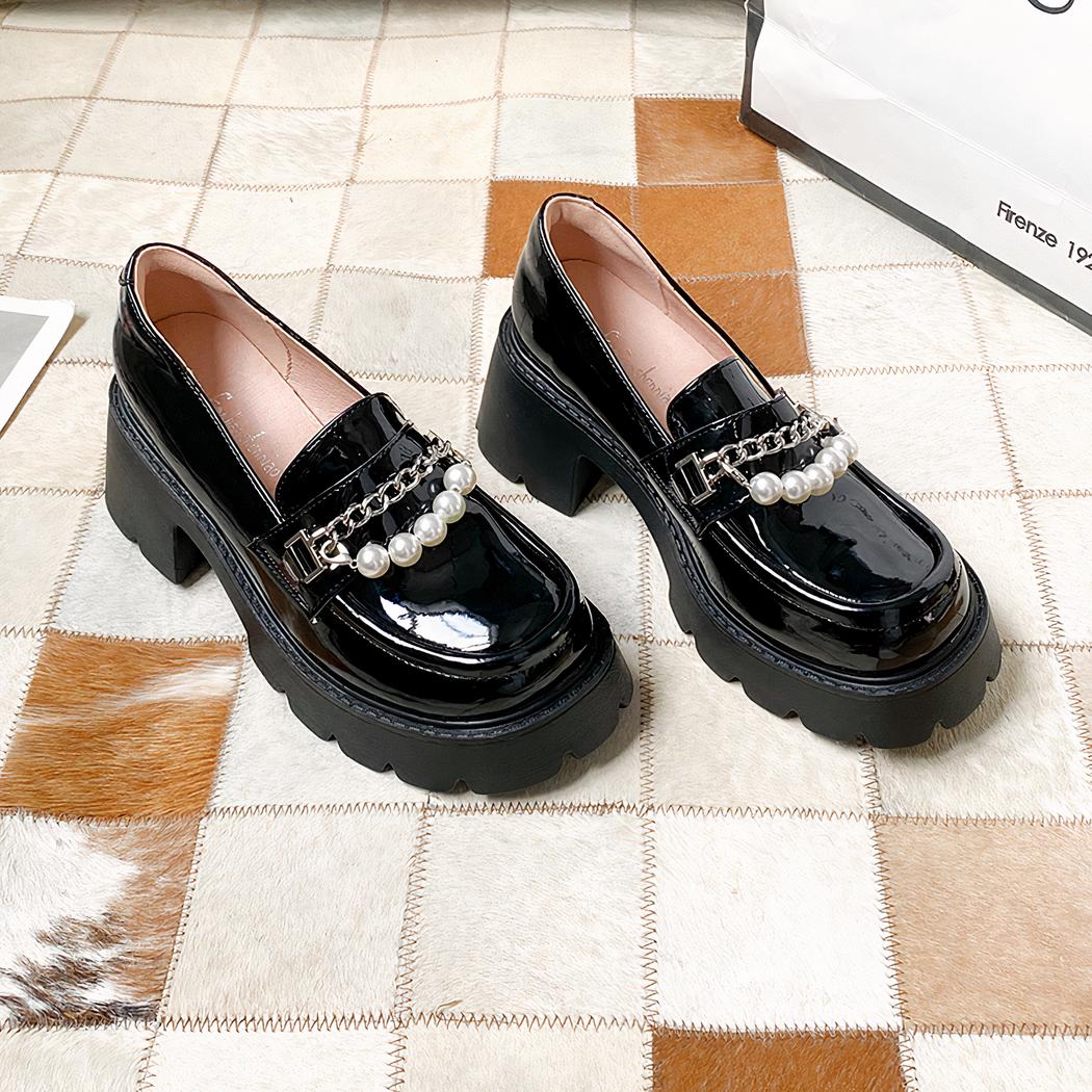 Ces jolies chaussures vont faire une entrée fracassante dans votre garde-robe ! Loin du traditionnel mocassin un peu ennuyeux, cette paire vient casser tous les codes avec son style assumé ! Le cuir vernis, la semelle épaisse et le talon carré, ce mocassin décoré de perles blanches et d’une chaîne argentée, vous donne un look chic et glamour jusqu’au bout des jambes.