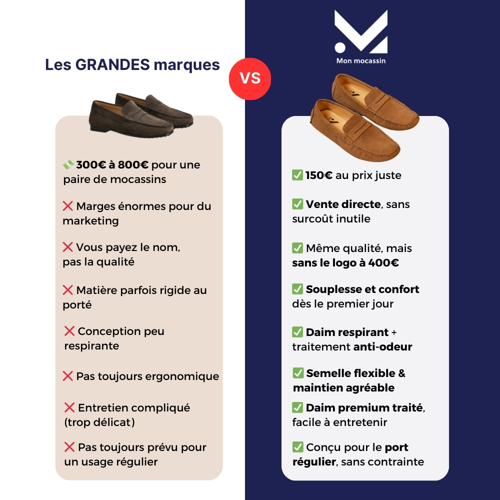 Nos modèles Signature, c’est le fruit de plusieurs mois de travail, de tests, de prototypes, et surtout d’exigence. On a sélectionné un daim premium, une coupe soignée et une fabrication sans compromis, pour proposer enfin un mocassin haut de gamme, au prix juste.