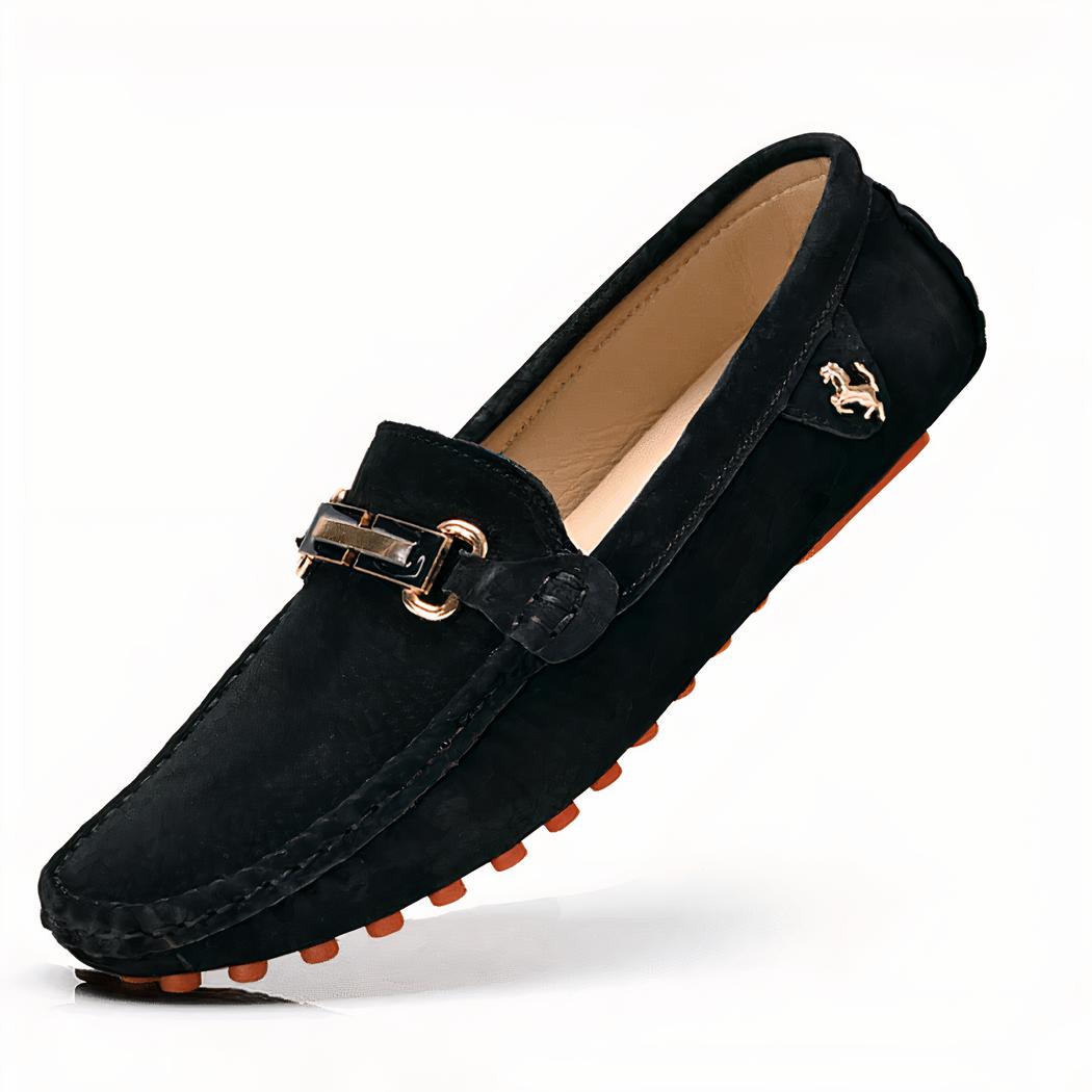 Ces mocassins de luxe pour homme sont confectionnés en daim doux et dotés d’une élégante boucle en métal doré sur le devant. Avec leur design classique et sophistiqué, ils sont parfaits pour ajouter un style chic à n’importe quelle tenue. La semelle intérieure rembourrée offre un confort optimal tout au long de la journée, faisant de ces mocassins une option idéale pour les occasions formelles ou décontractées.