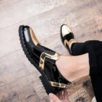 Avec leur finition brillante et leurs accents dorés, ces chaussures s’adaptent à n’importe quelle tenue chic ou décontractée.