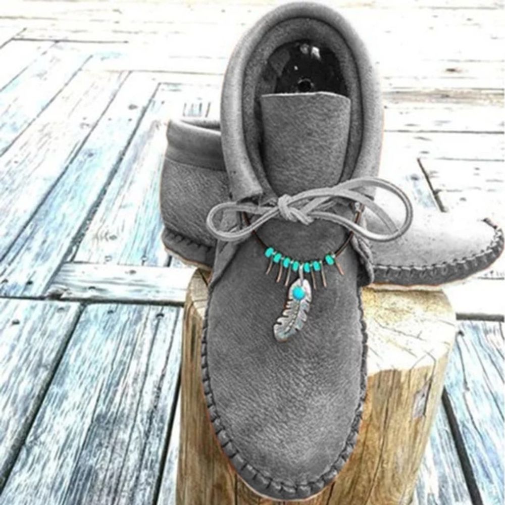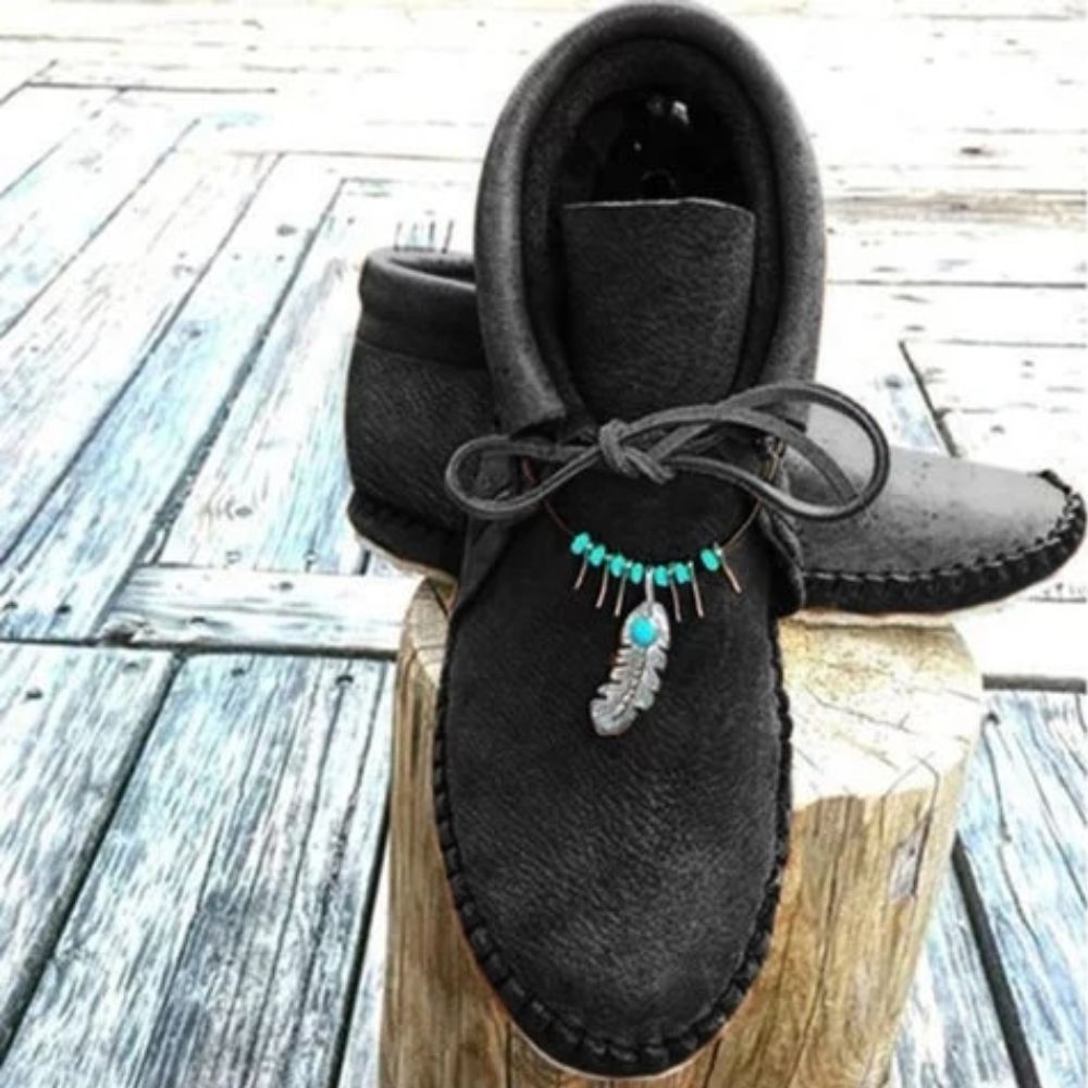 Nos mocassins indiens ont un style original et inspiré des anciennes chaussures amérindiennes. Leur design est simple et épuré Le petit bijou autour de la cheville apporte un style unique et une petite touche colorée avec ses perles bleues.